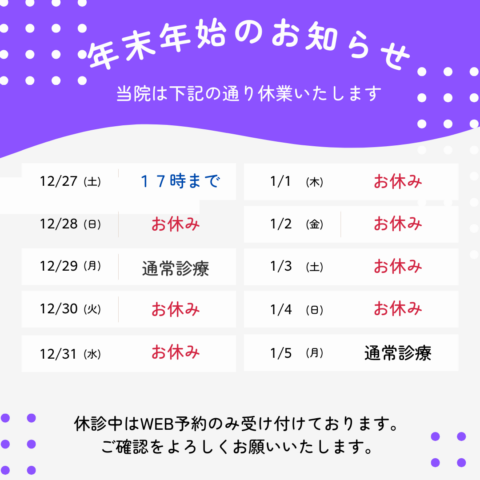 今年も残すところあと10日ばかりとなりました。 当院の年末年始の営業は12/29(月)が最終日となります。
